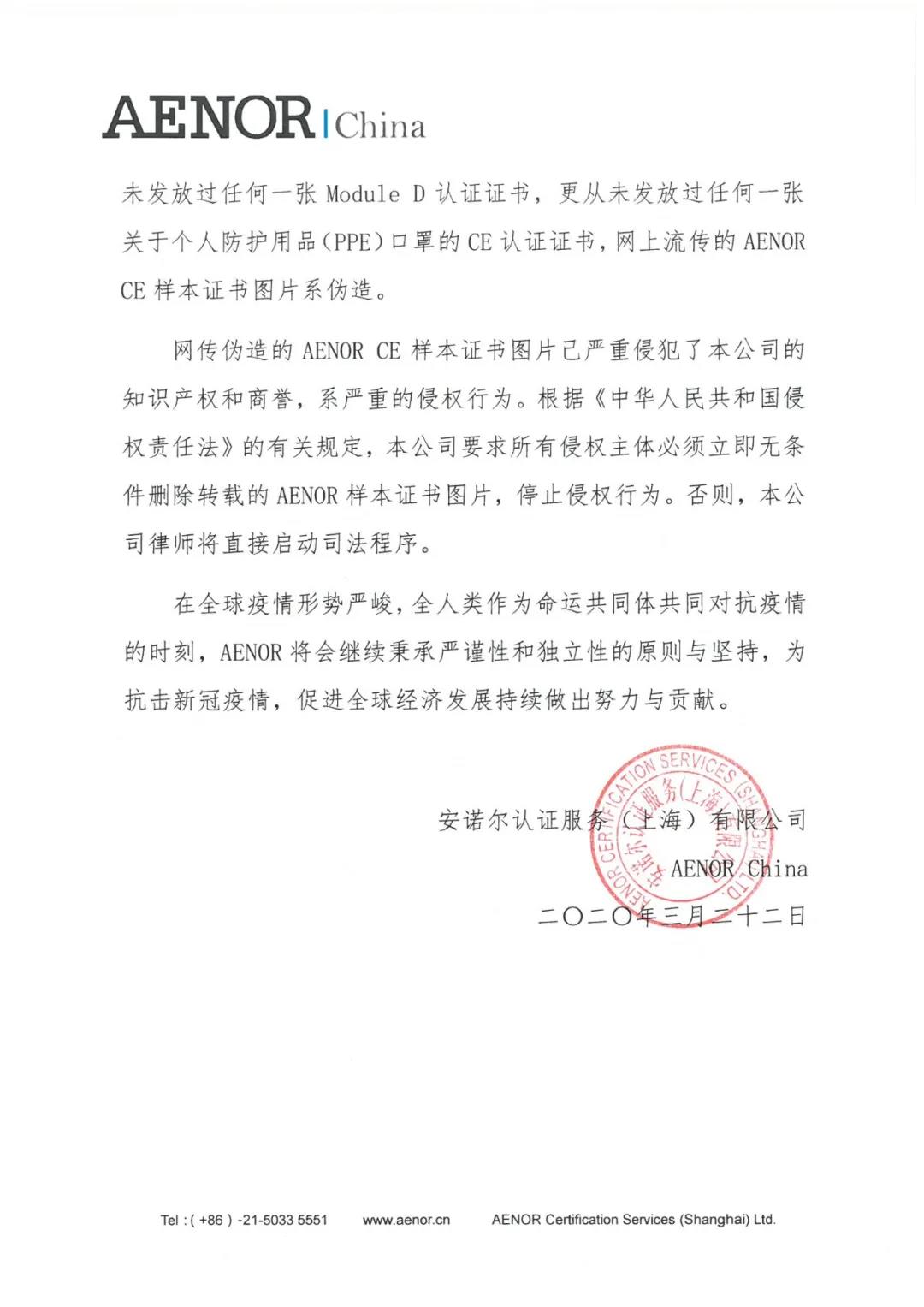 AENOR是經(jīng)國家認證認可監(jiān)督管理委員會批準的合法認證機構,AENOR雖然具有歐盟個人防護裝備(PPE)2016/425授權CE認證資質(zhì),可以進行Module D審核,但自成立至今,AENOR從未發(fā)放過任何一張Module D認證證書,更從未發(fā)放過任何一張關于個人防護用品(PPE)口罩的CE認證證書,網(wǎng)上流傳的AENOR CE樣本證書圖片系偽造。